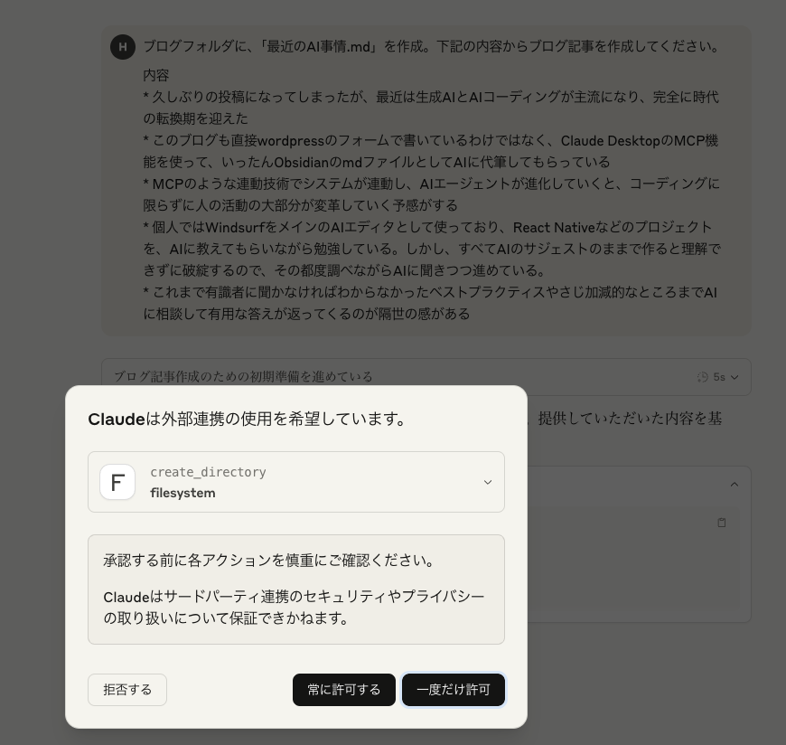 このブログ記事も、実は直接WordPressのフォームで書いているわけではありません。Claude DesktopのMCP(Machine Collaboration Protocol)機能を使って、AIに代筆してもらっています。具体的には、まずObsidianのマークダウンファイルとしてAIに下書きを作成してもらい、その後WordPressに投稿するというワークフローです。